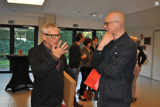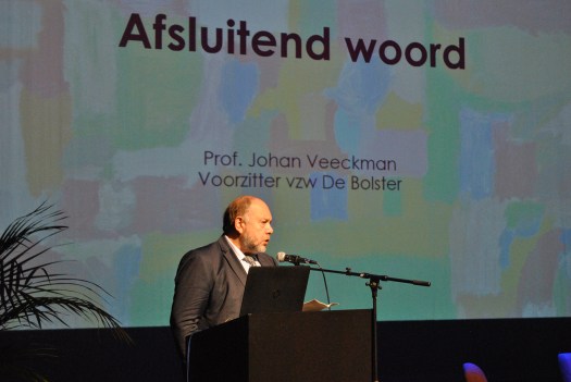 Het afsluitend woord is voor professor Johan Veeckman, algemeen directeur op rust van de Arteveldehogeschool en voorzitter van De Bolster. Daarin stelt hij mijn boekje voor. Een moment waarop ik echt pap in mijn benen krijg en mijn handen voor het eerst echt gaan trillen.