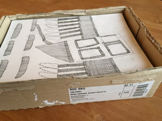 Ik kreeg de tekeningen mee naar huis in een doos van garage Schietecatte. Tijdens het gehele schrijfproces bleven ze op mijn bureau staan. Een muze in een kartonnen doos.